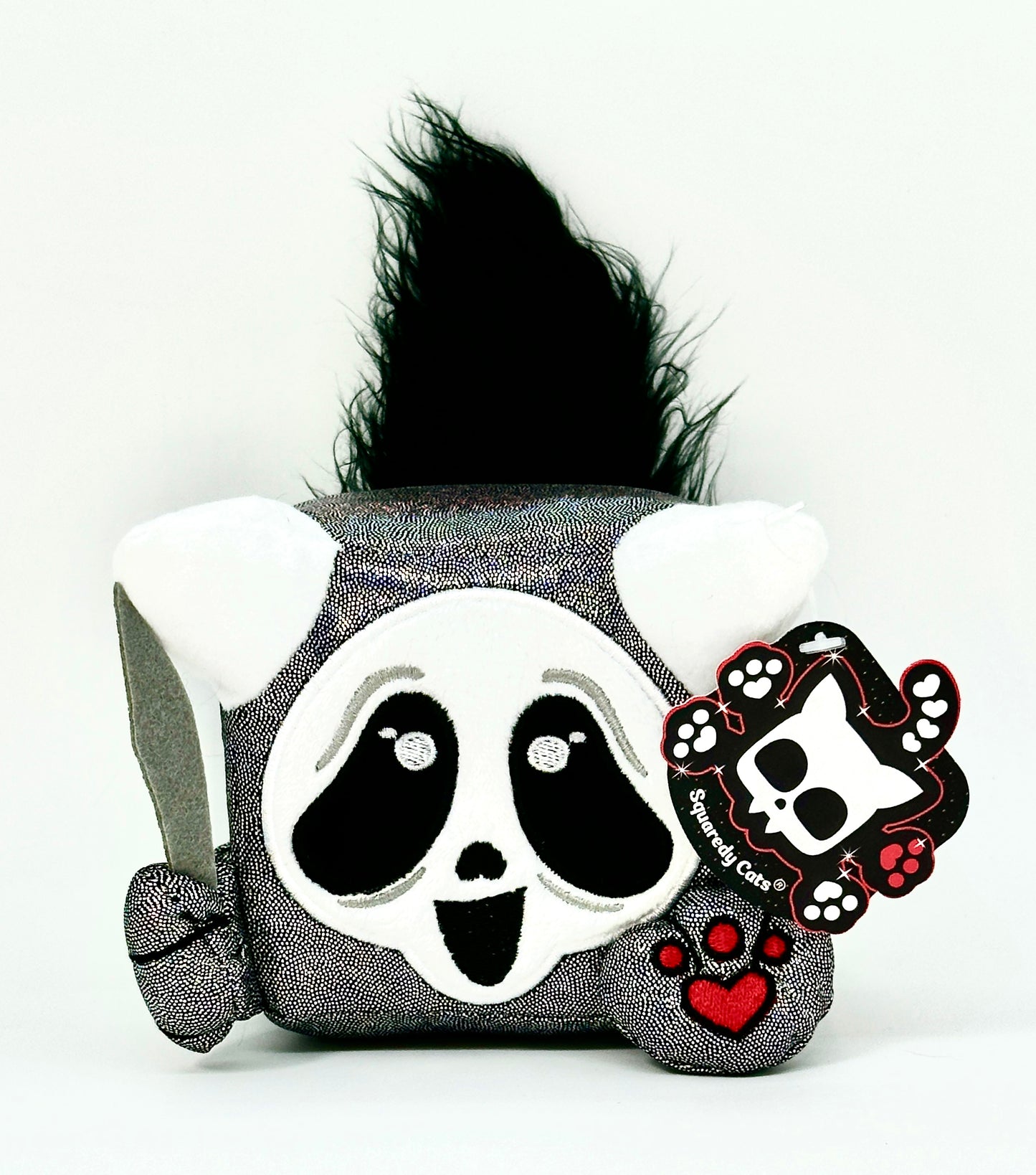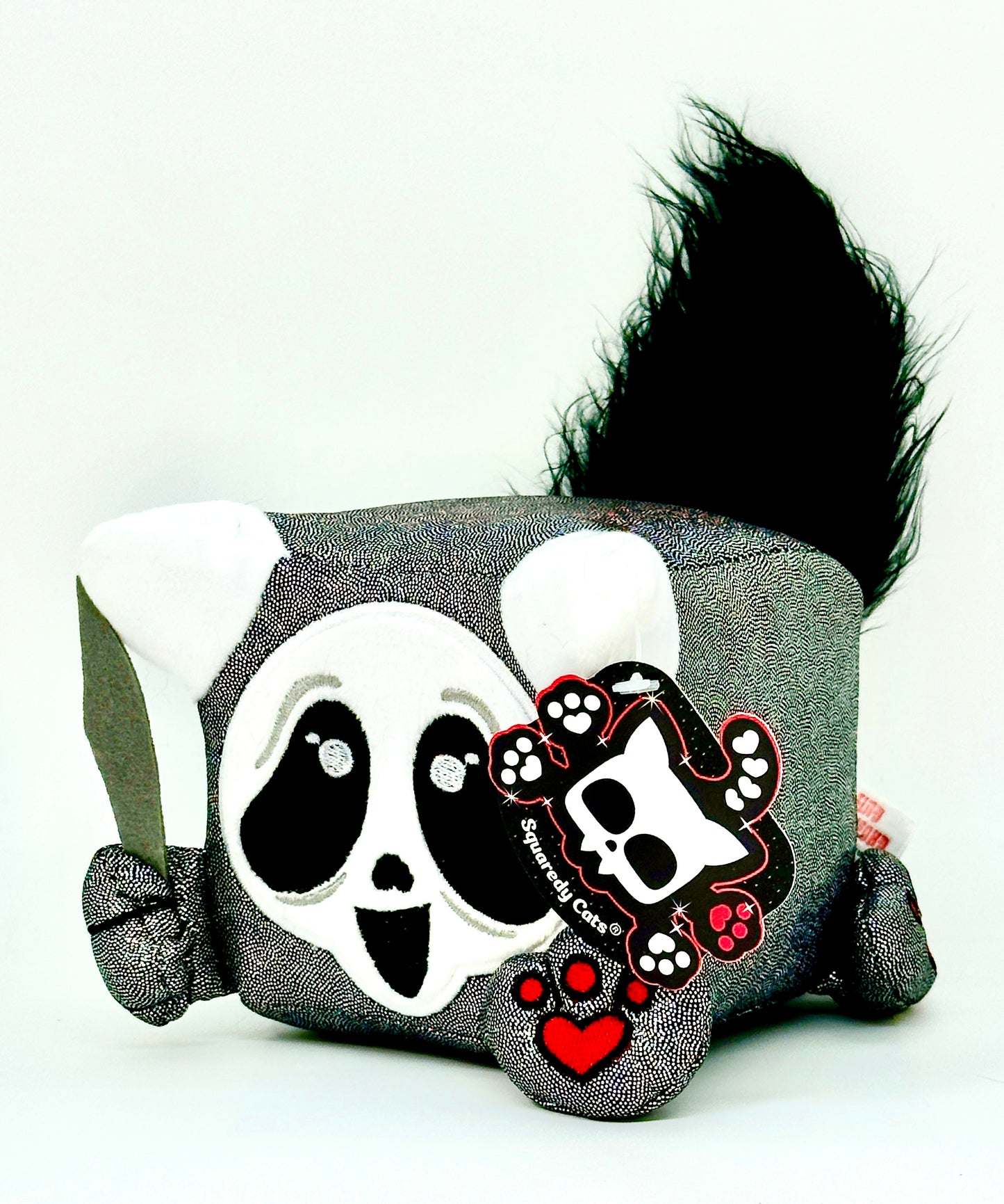 GhostPuss GLITZ plush is a limited edition, numbered sparkly black plush square cat parody of Ghostface from Scream. This is a parody, not an officially licensed product.